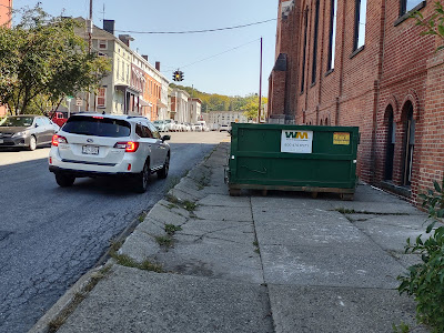 This afternoon, it appears that Mullen had to park a piece of machinery of theirs on Warren at 5th Street for the weekend. They had to leave most of it in a NO PARKING ZONE and just enough of it in a metered parking space to render the space unusable, unsafe and free of revenue in the form of quarters -- FOR THE ENTIRE WEEKEND in downtown Hudson. So very thoughtful of Mullen, isn't it? Even when they aren't working, they are disrupting downtown parking. For how much longer?